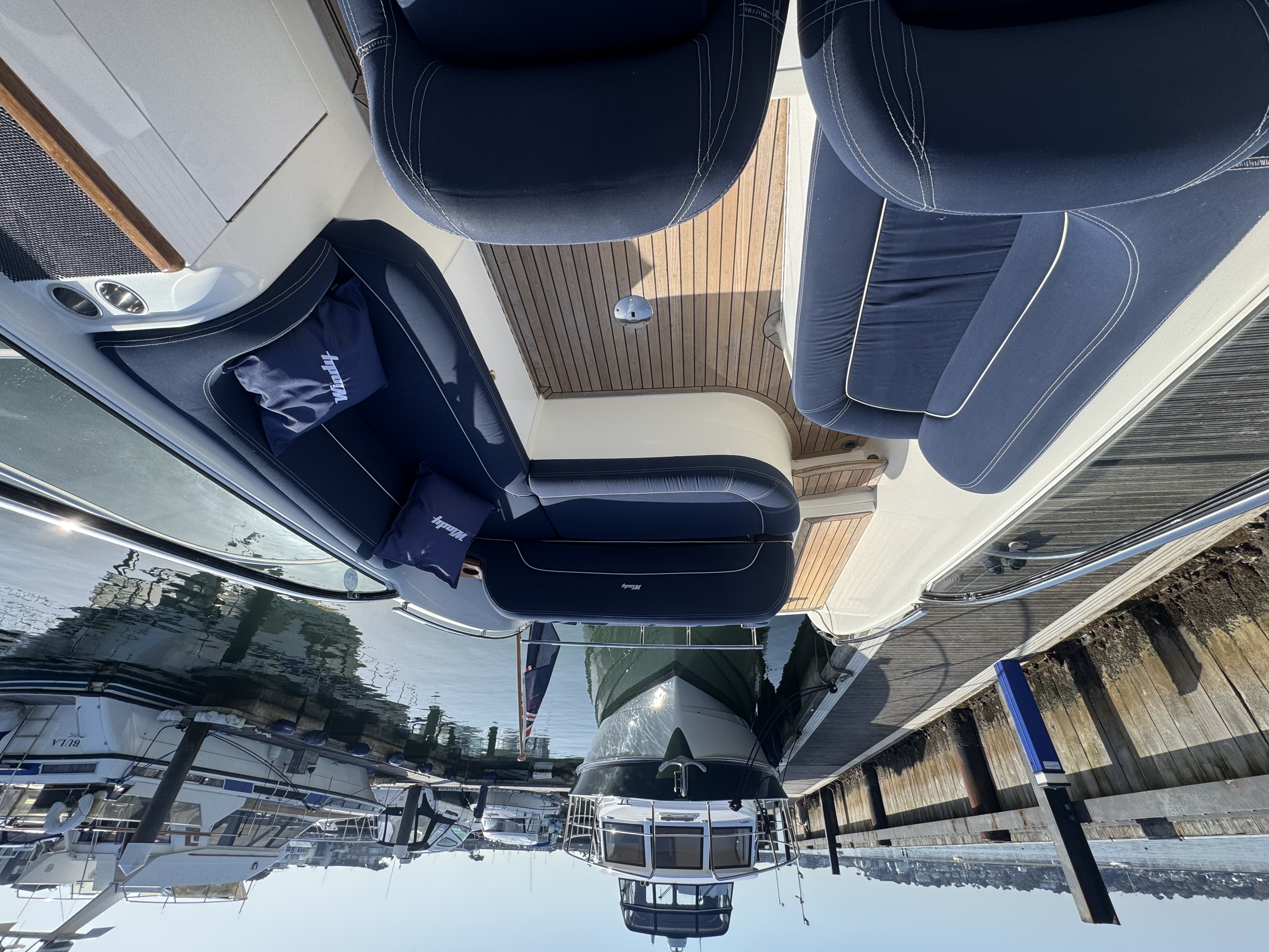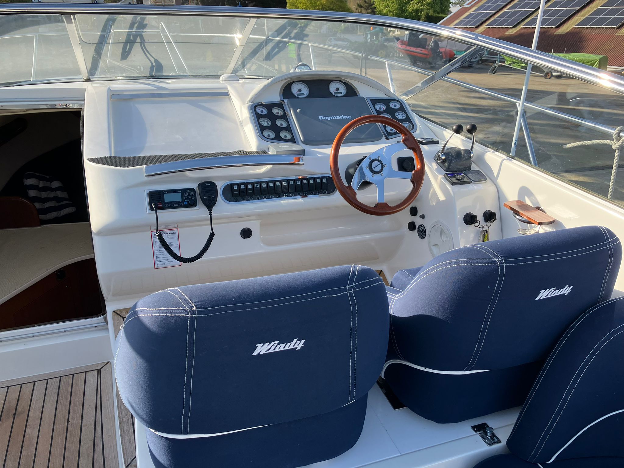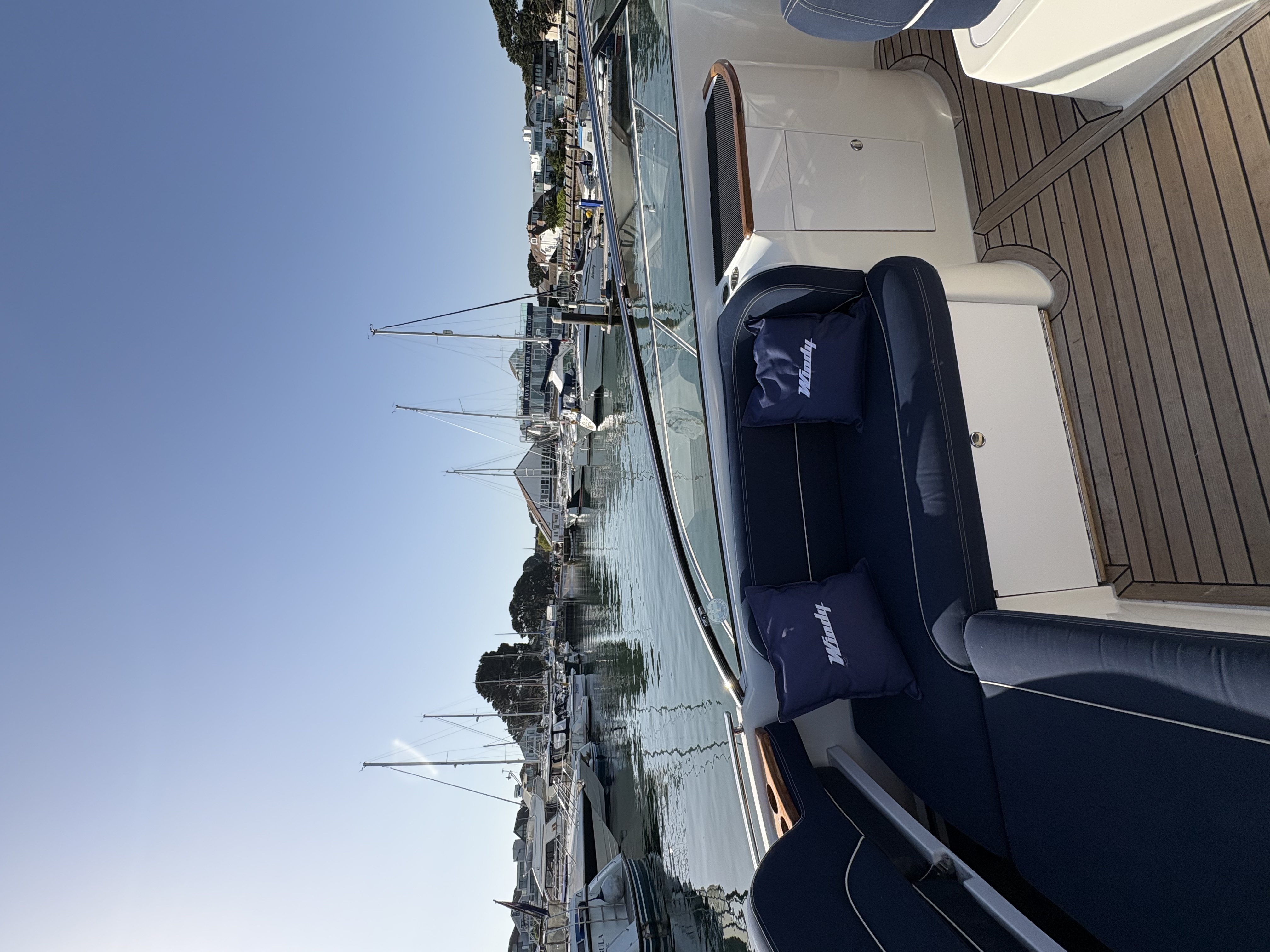 In the cockpit area you will find a common Windy feature of an adjustable sunpad cushion in sunbrella, which allows you to enjoy your sun bathing time either facing forward or aft of the boat, this particular one is electronic.